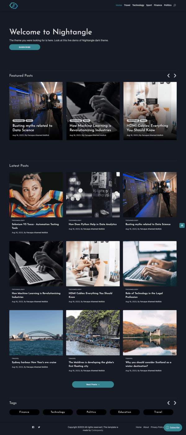 Nightingale is a premium Ghost theme developed and maintained by our skilled team. This theme has both light and dark versions. You can switch between dark and light versions from the Ghost theme's settings panel.